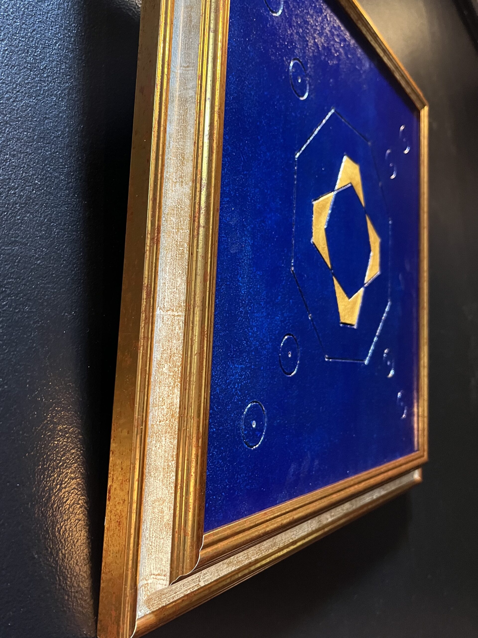 Technique: Gravure sur bois peinte à l’acrylique et vernis brillant, Or véritable.