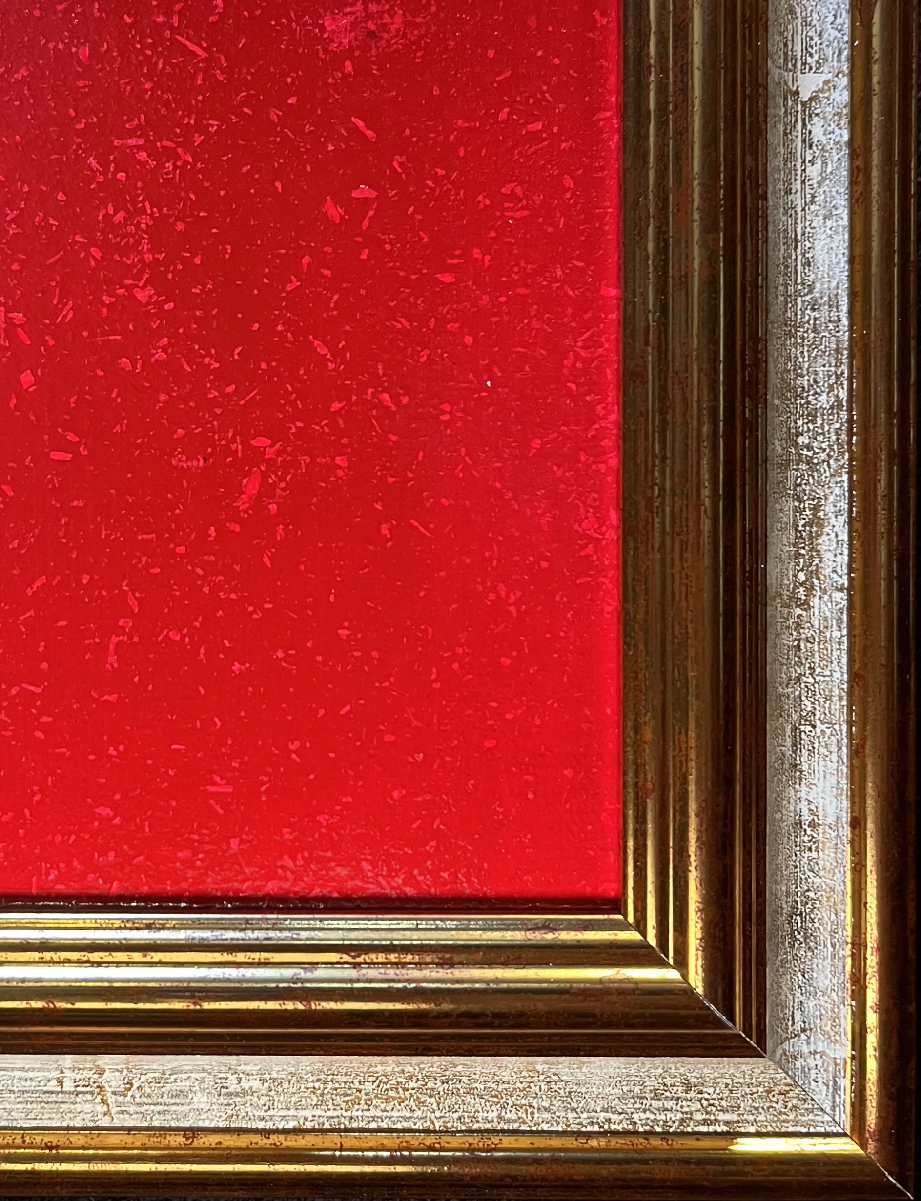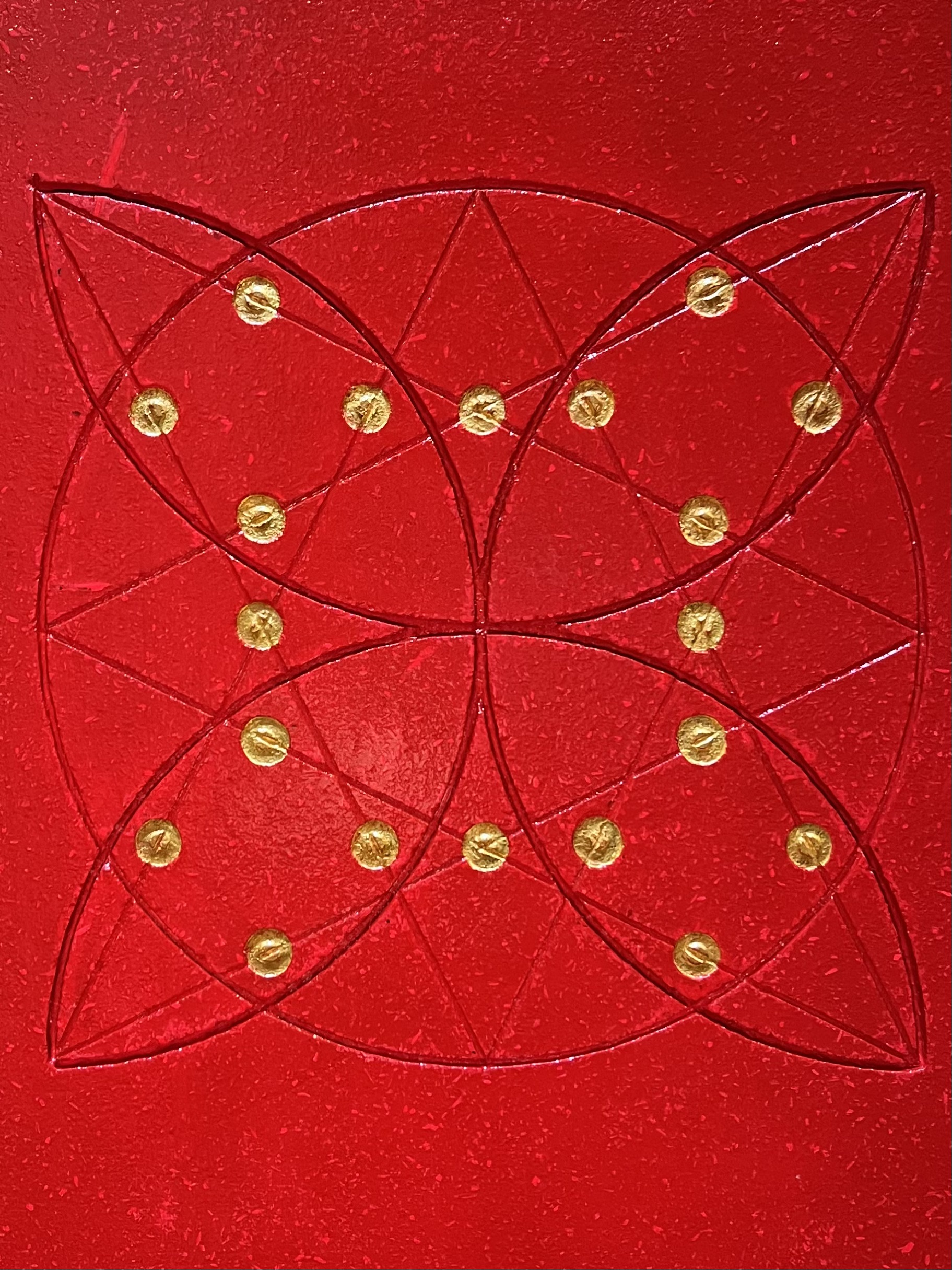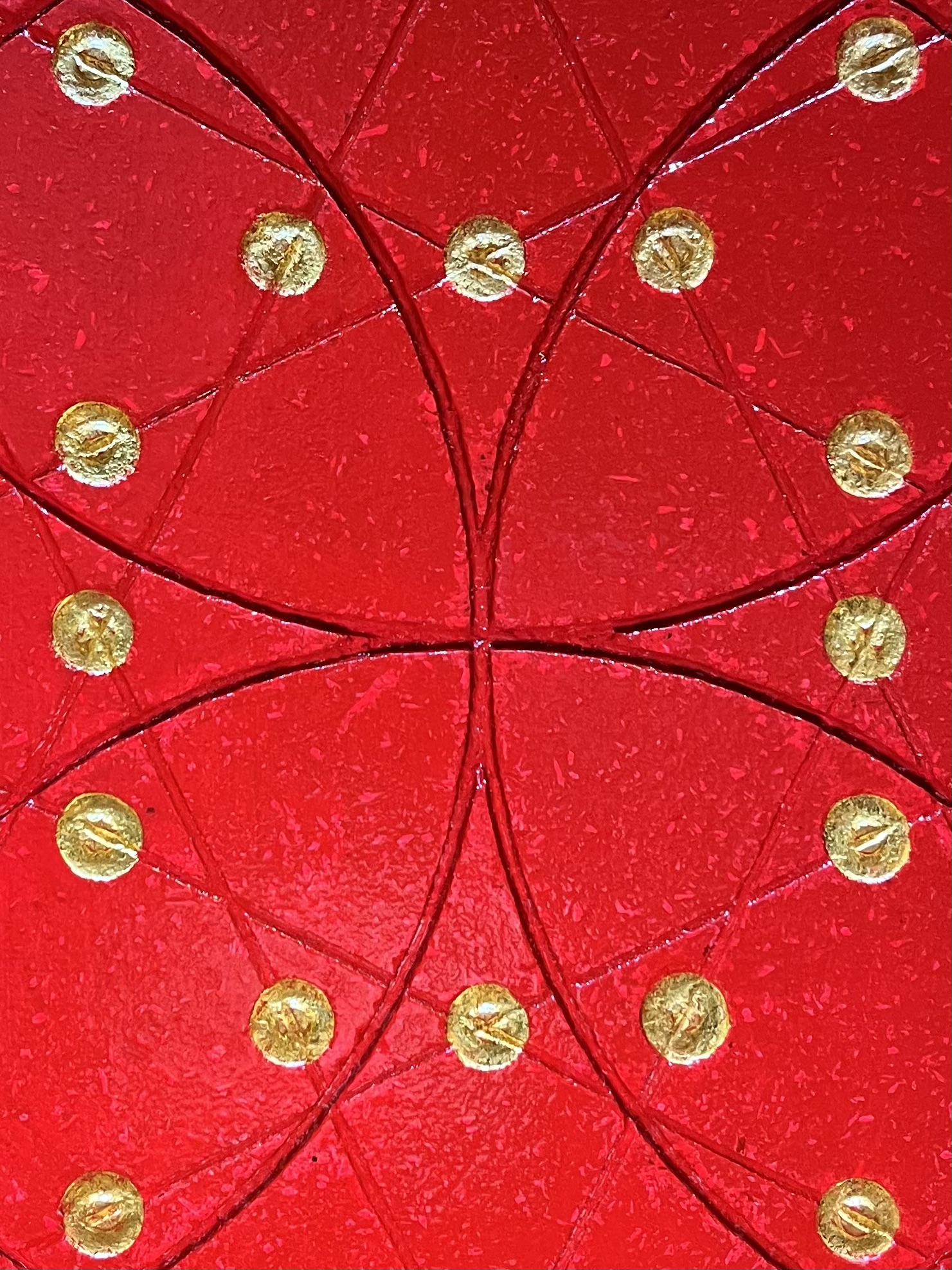 Technique: Gravure sur bois peinte à l’acrylique et vernis brillant, Or véritable.